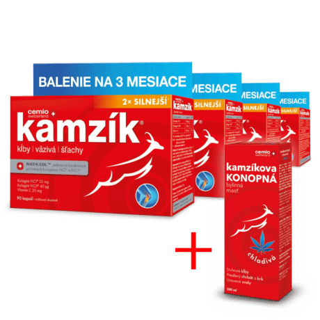 Cemio KAMZÍK® je špičkový kĺbový prípravok, ktorý jediný v Slovenskej republike obsahuje kombináciu natívneho kolagénu NCI®, natívneho kolagénu NCII® a vitamínu C. Predstavuje jedinečné spojenie rýdzej prírody a špičkovej technológie. Teraz je navyše 2× silnejší.*