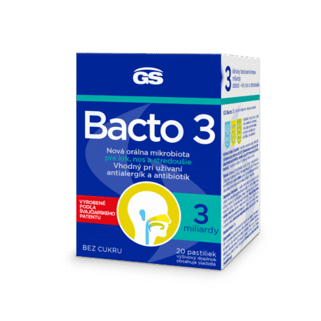 výživový doplnokGS Bacto 3 je nové orálne probiotikum s vitamínom D na podporu imunity slizníc hrdla, nosa a stredného ucha. Obsahuje 3 špeciálne probiotické kmene, 3 miliardy prospešných baktérií, ktoré kolonizujú horné dýchacie cesty už 3 dni po podaní. Na podporu ORL zdravia, pri užívaní antibiotík, antialergík a pre dlhodobé zdravie ústnej dutiny. Pre dospelých a deti od 3 rokov. Pastilky s výbornou čerešňovou príchuťou, bez cukru..