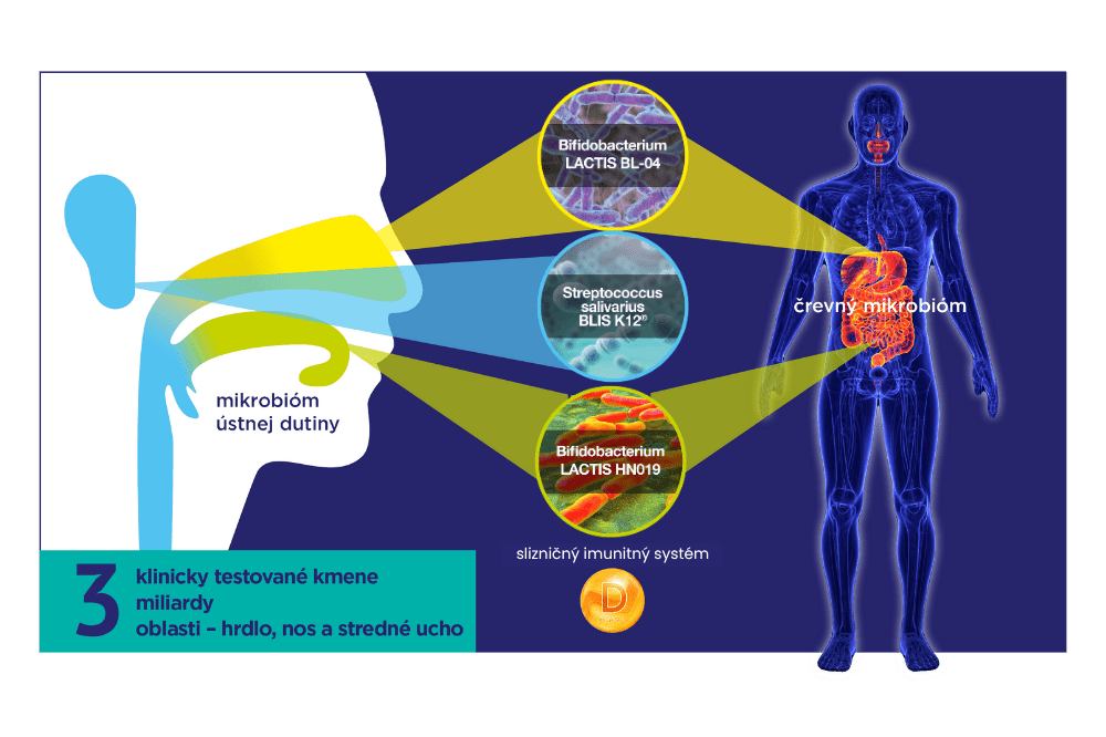 Nové orálne probiotikum na osídlenie hrdla, nosa a stredného ucha a na celkovú podporu slizničného imunitného systému. Jedinečná kombinácia 3 klinicky testovaných a dobre zdokumentovaných probiotických kmeňov v kombinácii s vitamínom D, ktorý podporuje celkovú imunitu aj imunitu slizníc horných dýchacích ciest (hrdla, nosa a stredného ucha).